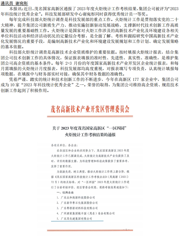 集團(tuán)公司榮獲茂名高新區(qū)“2023年科技統(tǒng)計優(yōu)秀企業(yè)”