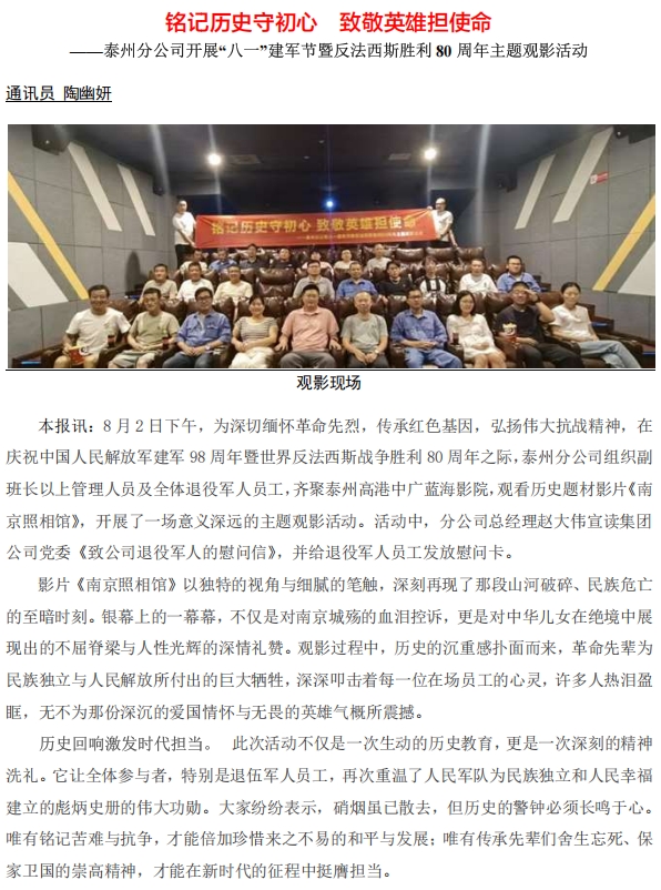 泰州分公司開(kāi)展“八一”建軍節(jié)暨反法西斯勝利80周年主題觀影活動(dòng)